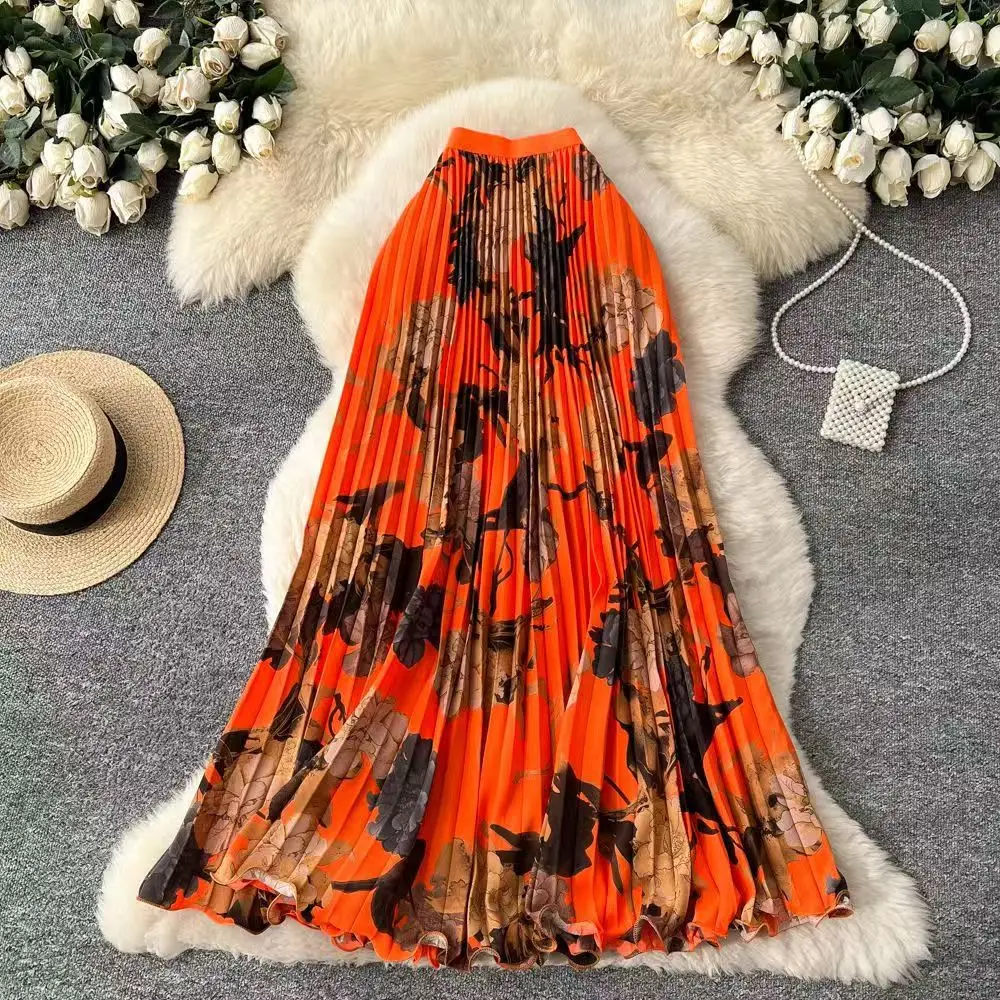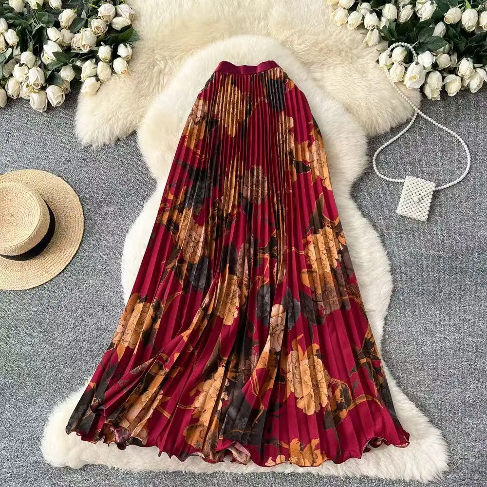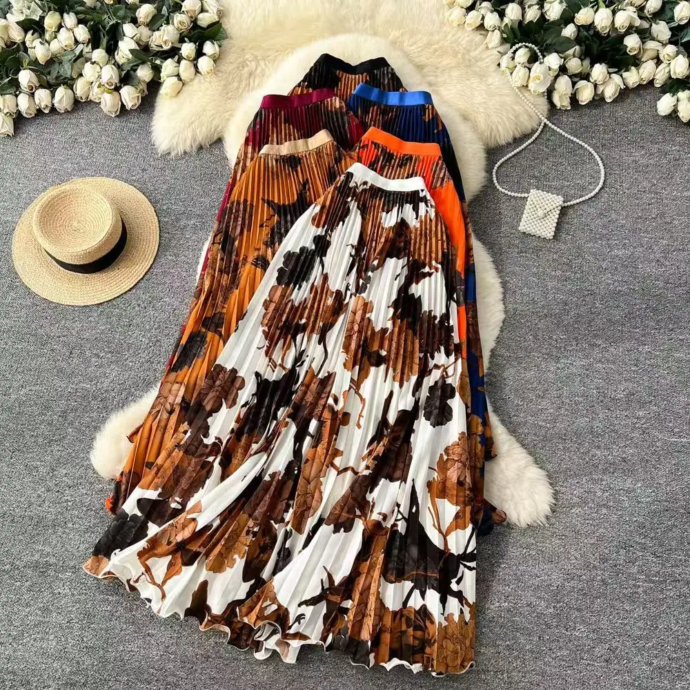 GX0009A Fashion Summer 2025 High Waist Unique Clothing Pleated Style Casual Ladies A-line Elegant Printed Long Women Skirt